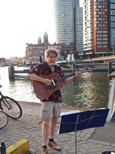 Carrying the connection idea further, I developed a love for busking. I found deep satisfaction in standing out on the sidewalk and singing my songs. I watch the people walk by: families, friends out for a fun evening, couples on a date, individuals headed somewhere or nowhere, cars and motorcycles revving their engines, a man carrying a sign saying something about Confederate money and yelling at the top of his lungs (I couldn't compete with him. I would just strum when he passed :-D). I enjoy being on the same level as my audience, exchanging smiles, talking, making new friends. I somehow feel more a part of the world when I busk, like I'm doing my part in helping the world to go about its daily business. When I busk, I often look up at the sky and think about how lucky I am to get to do it. My favorite spot for busking in Richmond was in Carytown. I've brought my love for busking across the Atlantic and enjoy playing here in Rotterdam. I love watching the sunset while I play at the Rijnhaven.